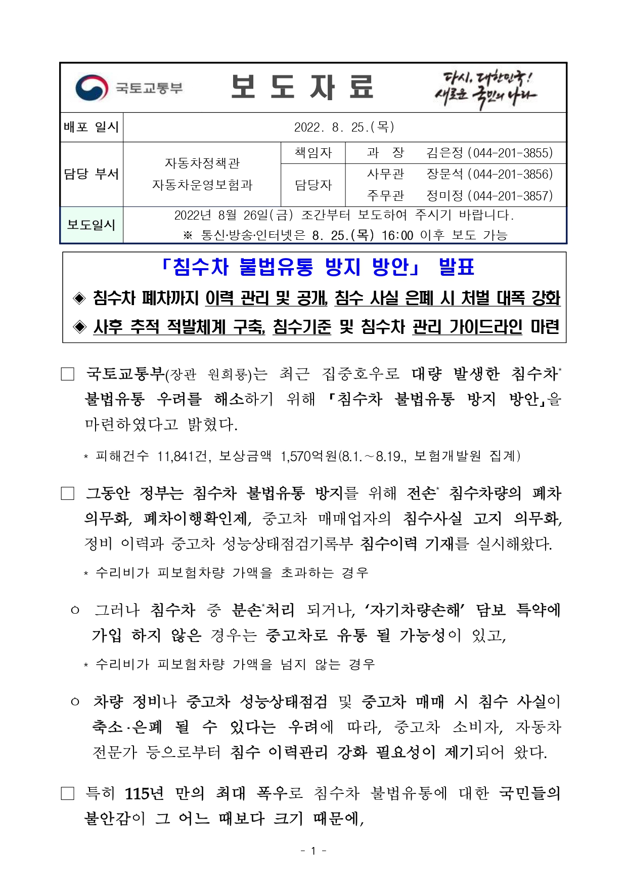 국토교통부(장관 원희룡)는 최근 집중호우로 대량 발생한 침수차* 불법유통 우려를 해소하기 위해 ?침수차 불법유통 방지 방안?을 마련하였다고 밝혔다.* 피해건수 11,841건, 보상
