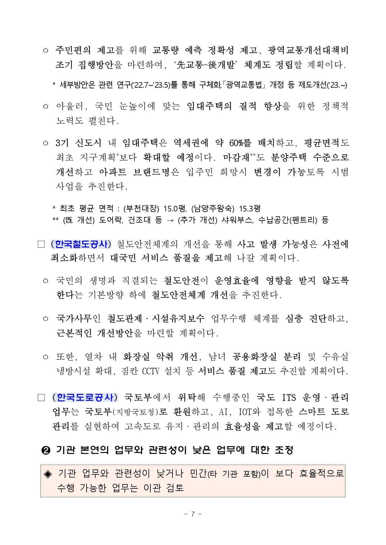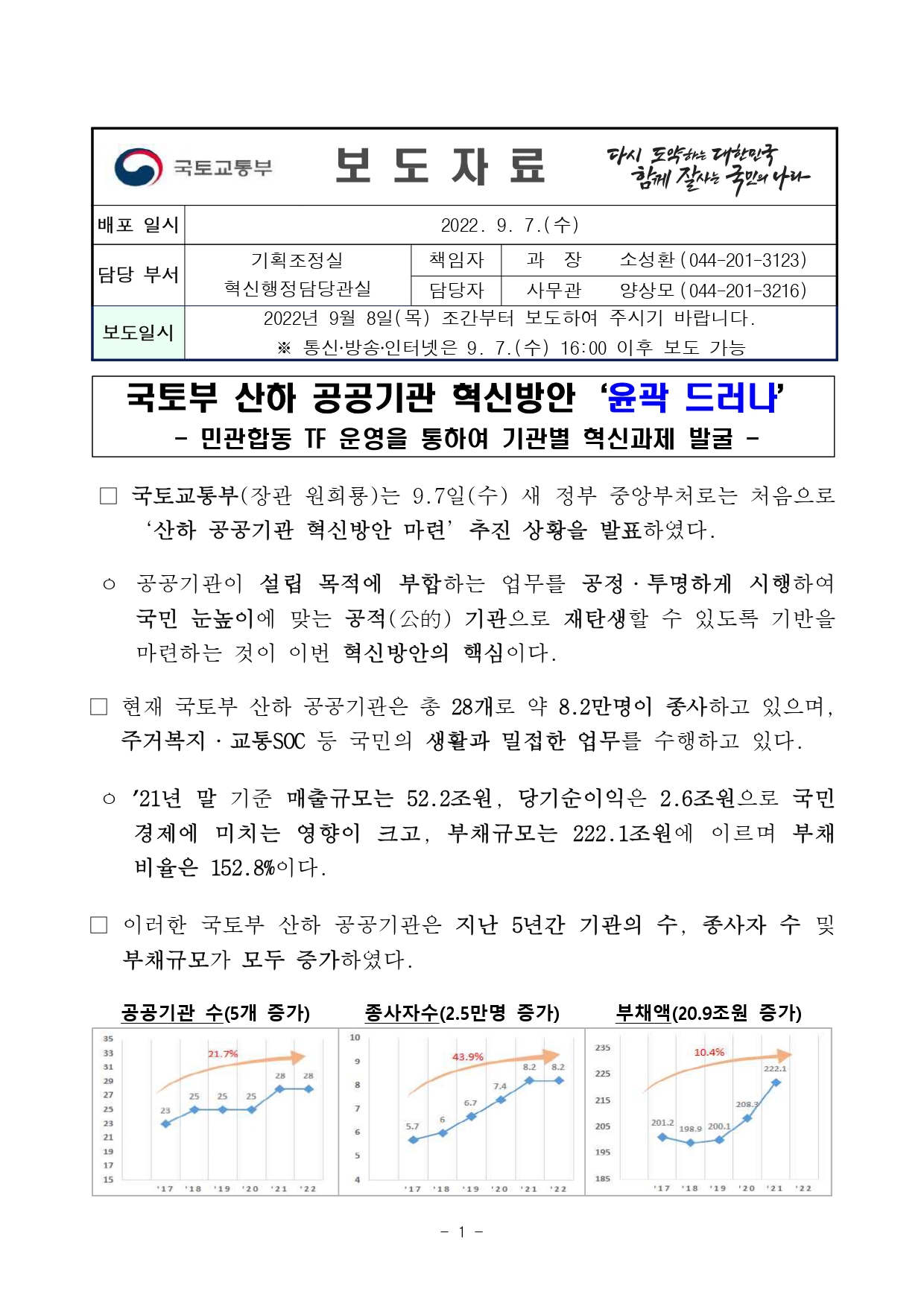 국토교통부(장관 원희룡)는 9.7일(수) 새 정부 중앙부처로는 처음으로‘산하 공공기관 혁신방안 마련’추진 상황을 발표했다.