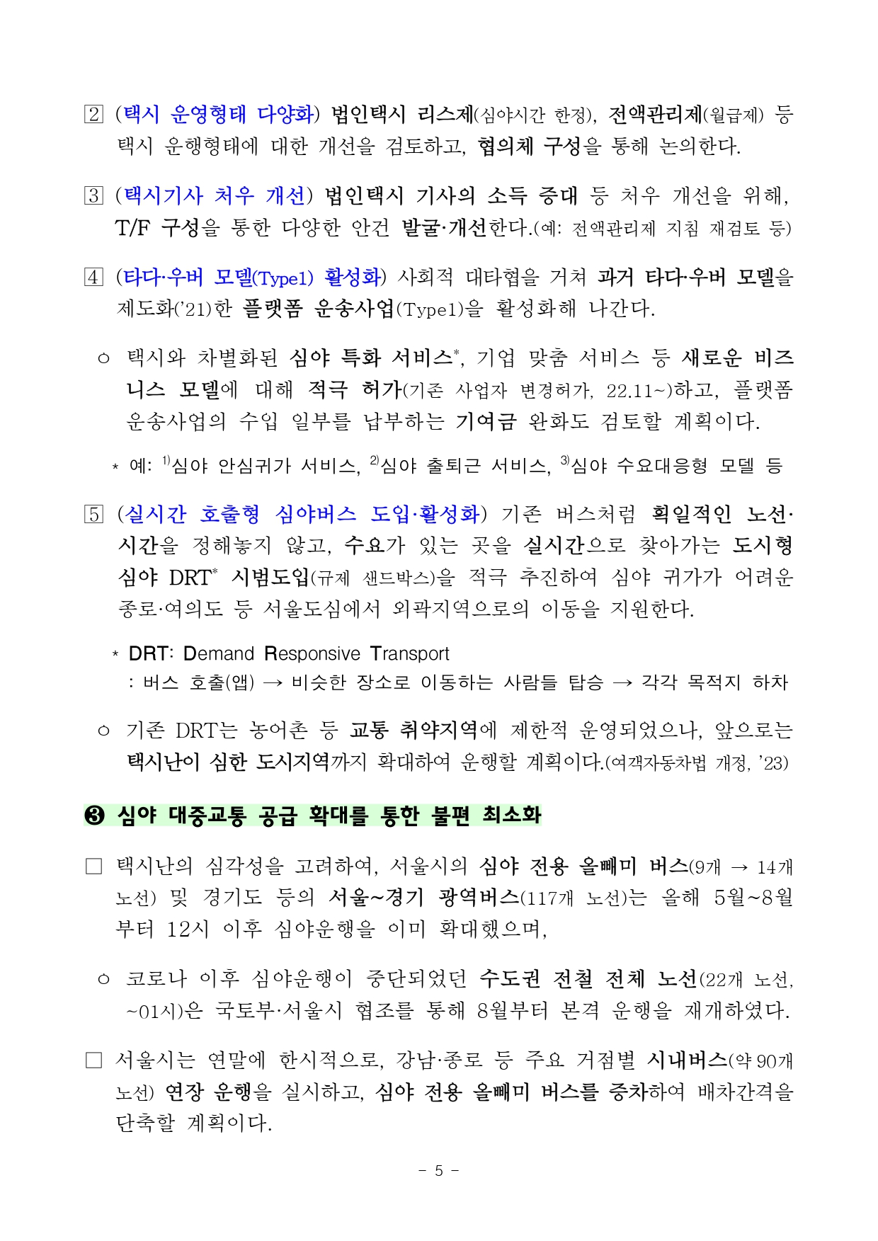 · 심야 한정 탄력 호출료 확대(現 최대 3천원→ 최대 4~5천원, 수도권 시범운영)