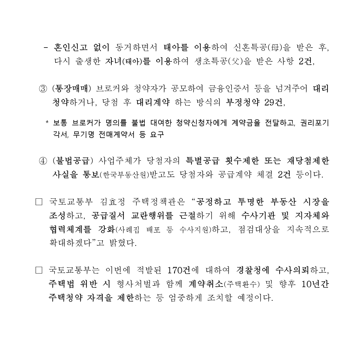- 혼인신고 없이 동거하면서 태아를 이용하여 신혼특공(母)을 받은 후, 다시 출생한 자녀(태아)를 이용하여 생초특공(父)을 받은 사항 2건,