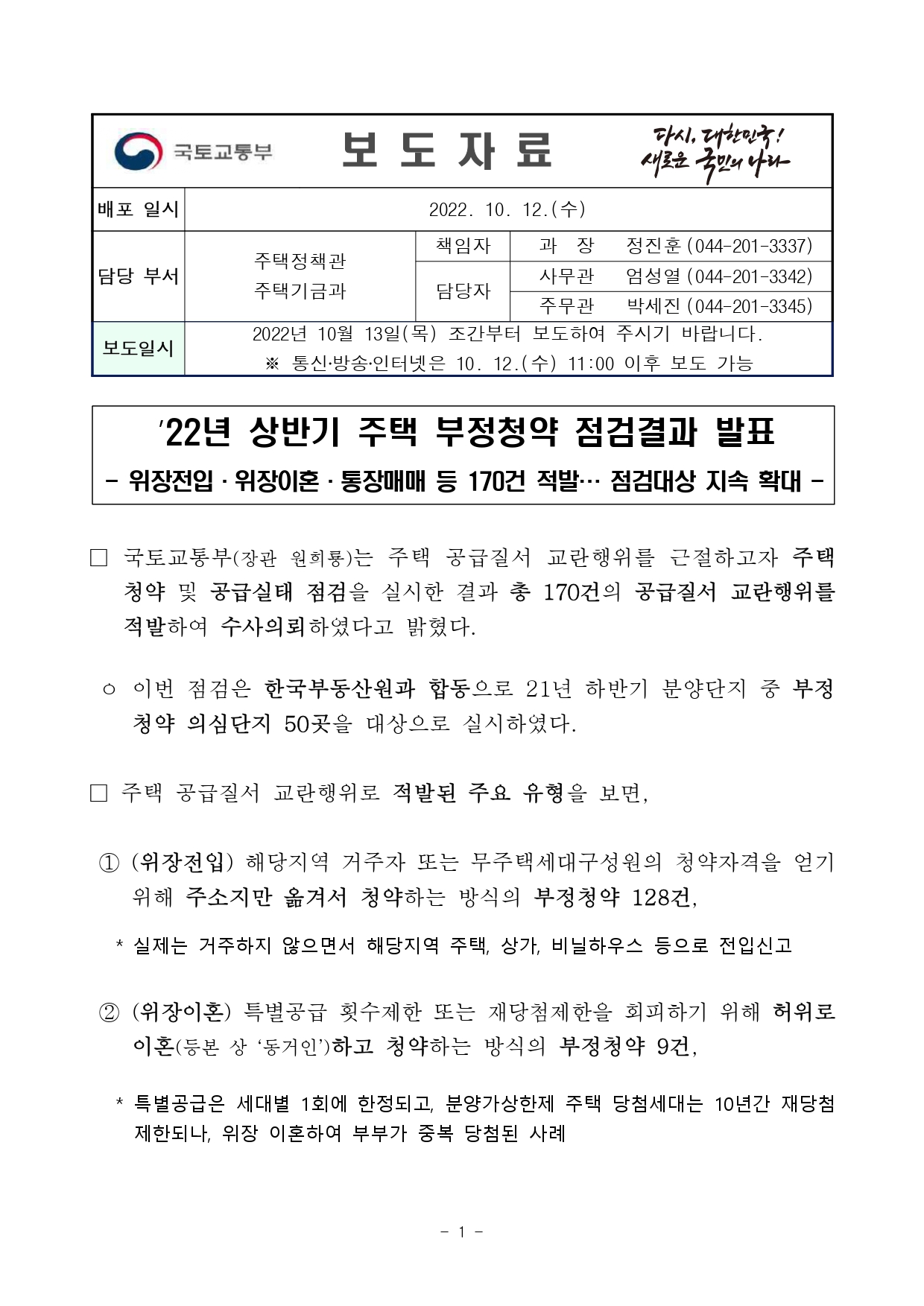 국토교통부(장관 원희룡)는 주택 공급질서 교란행위를 근절하고자 주택 청약 및 공급실태 점검을 실시했다. 그 결과 총 170건의 공급질서 교란행위를 적발하여 수사의뢰하였다고 밝혔다.