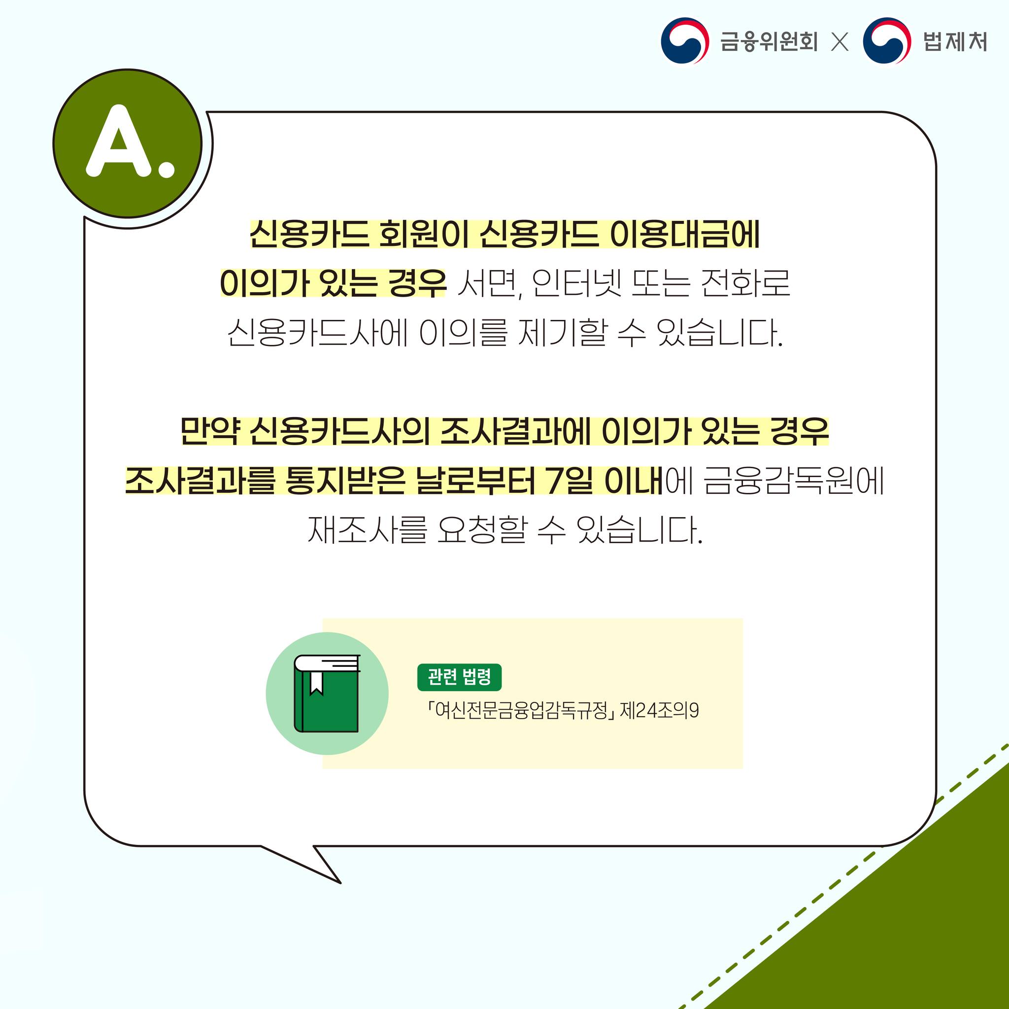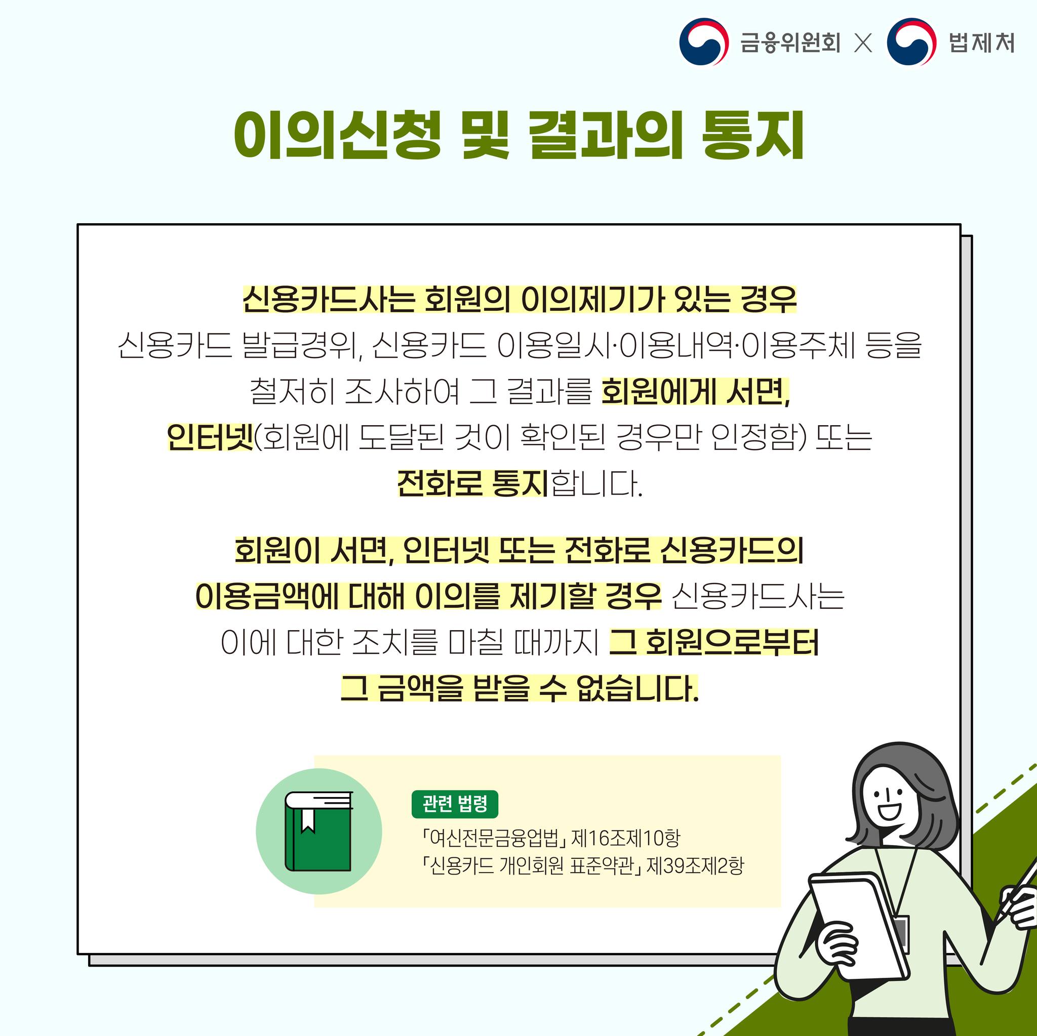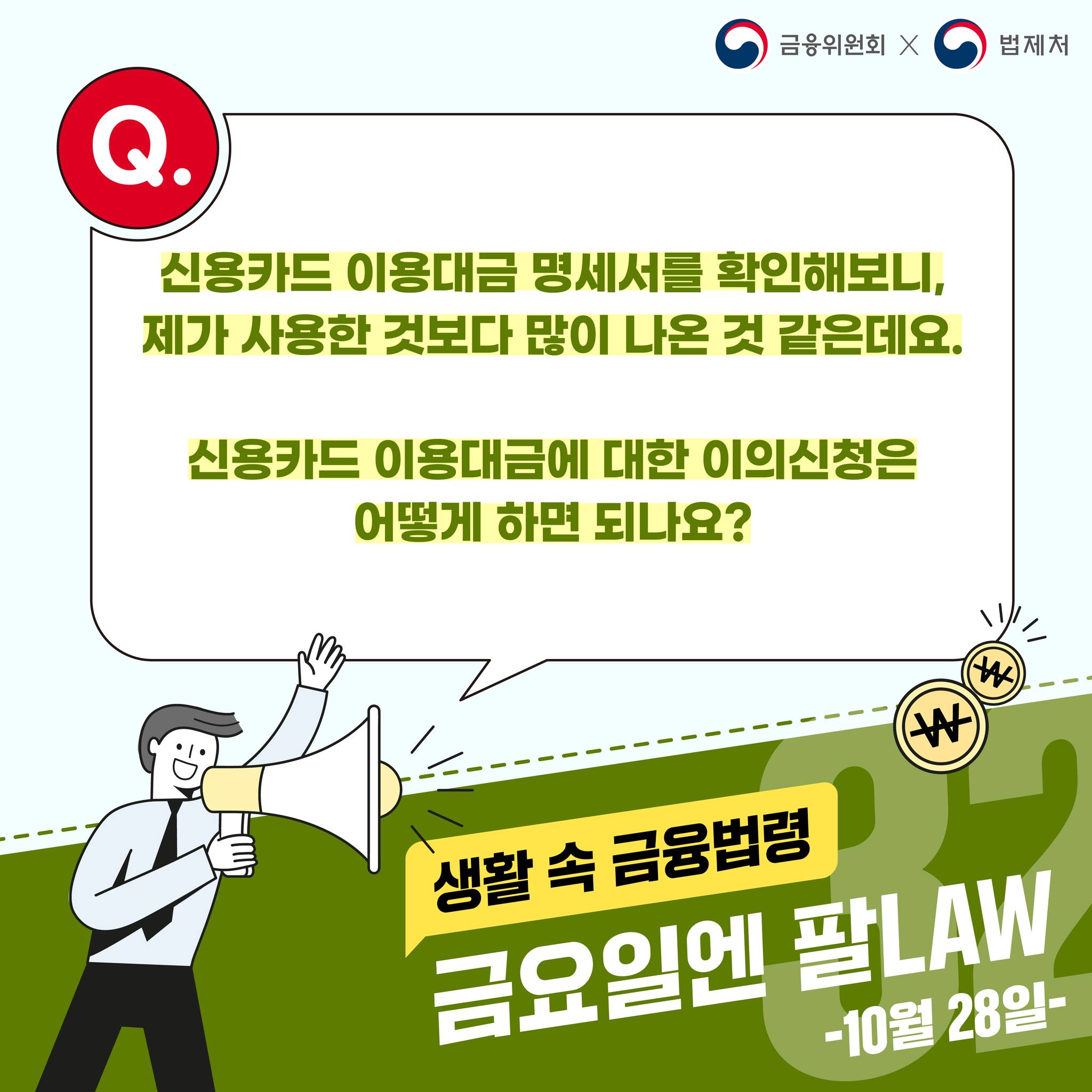 신용카드 이용대금에 대한 이의신청은 어떻게 하면 되나요? [생활 속 금융법령 금요일엔 팔로우(law)] 2022-10-28 생활 속 금융법령! 금요일엔 팔LAW ⠀⠀⠀⠀⠀ 금융위원회(@fsc.go.kr)X법제처(@moleg.go.kr