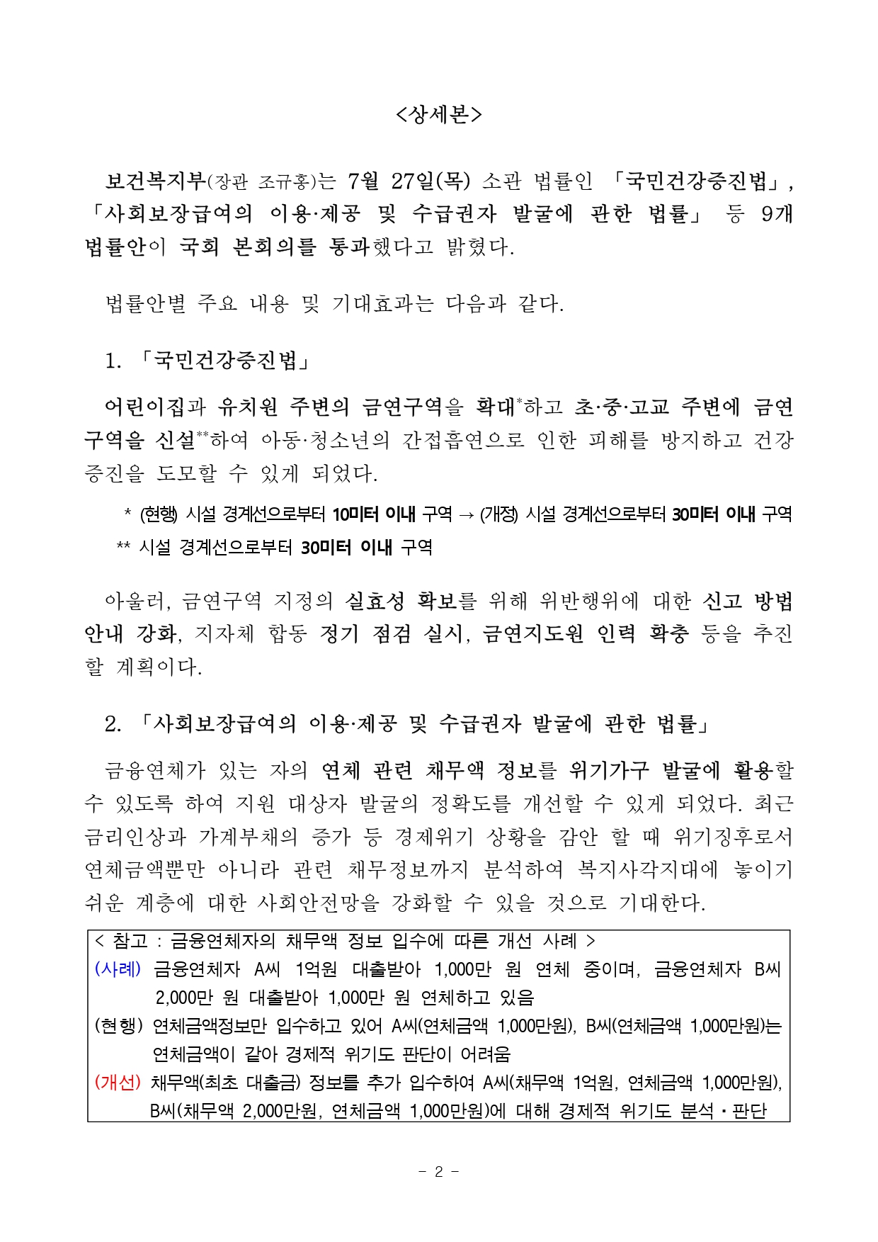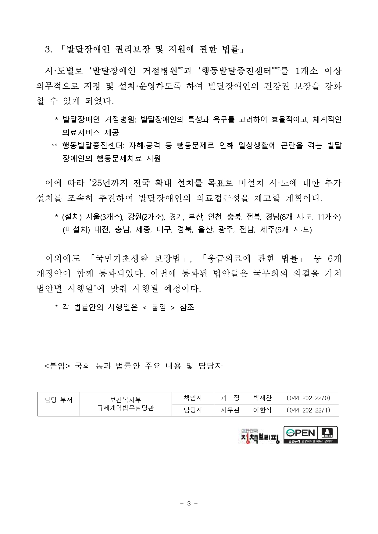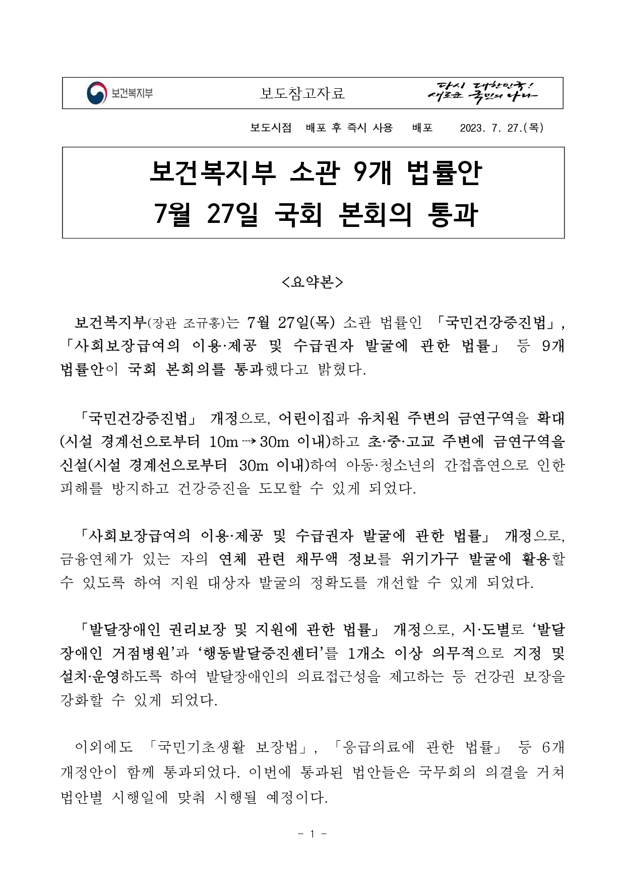 보도자료 보건복지부 소관 9개 법률안 7월 27일 국회 본회의 통과 등록일 : 2023-07-27[최종수정일 : 2023-07-27] 조회수 : 497 담당자 : 이한석 담당부서 : 규제개혁법무담당관 보건복지부 소관 9개 법률