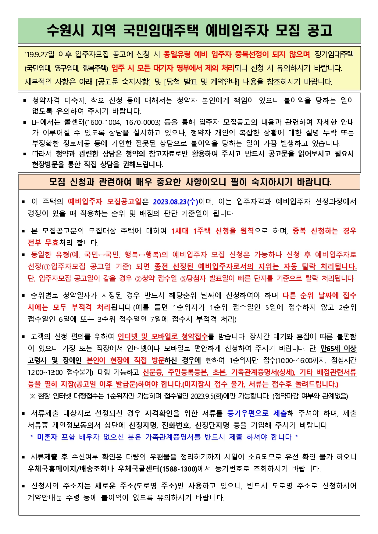 수원시 지역 국민임대주택 예비입주자 모집 공고 자세한 내용은 다음과 같습니다.