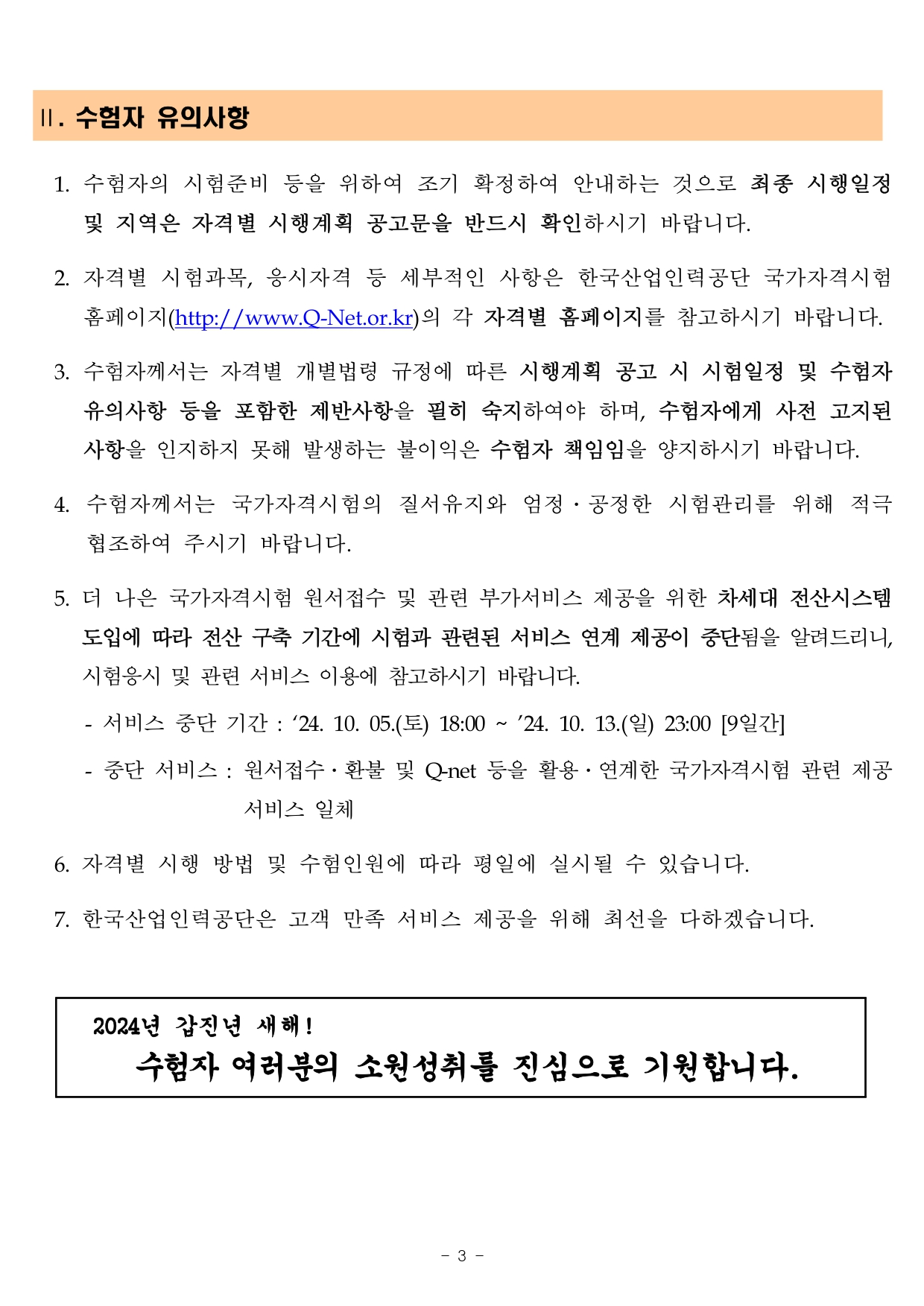 개별 자격법령․고시 등의 위탁 규정에 따라 한국산업인력공단에서 시행하는 2024년도 국가전문자격시험 시행일정 및 시행지역을 다음과 같이 사전 안내합니다.