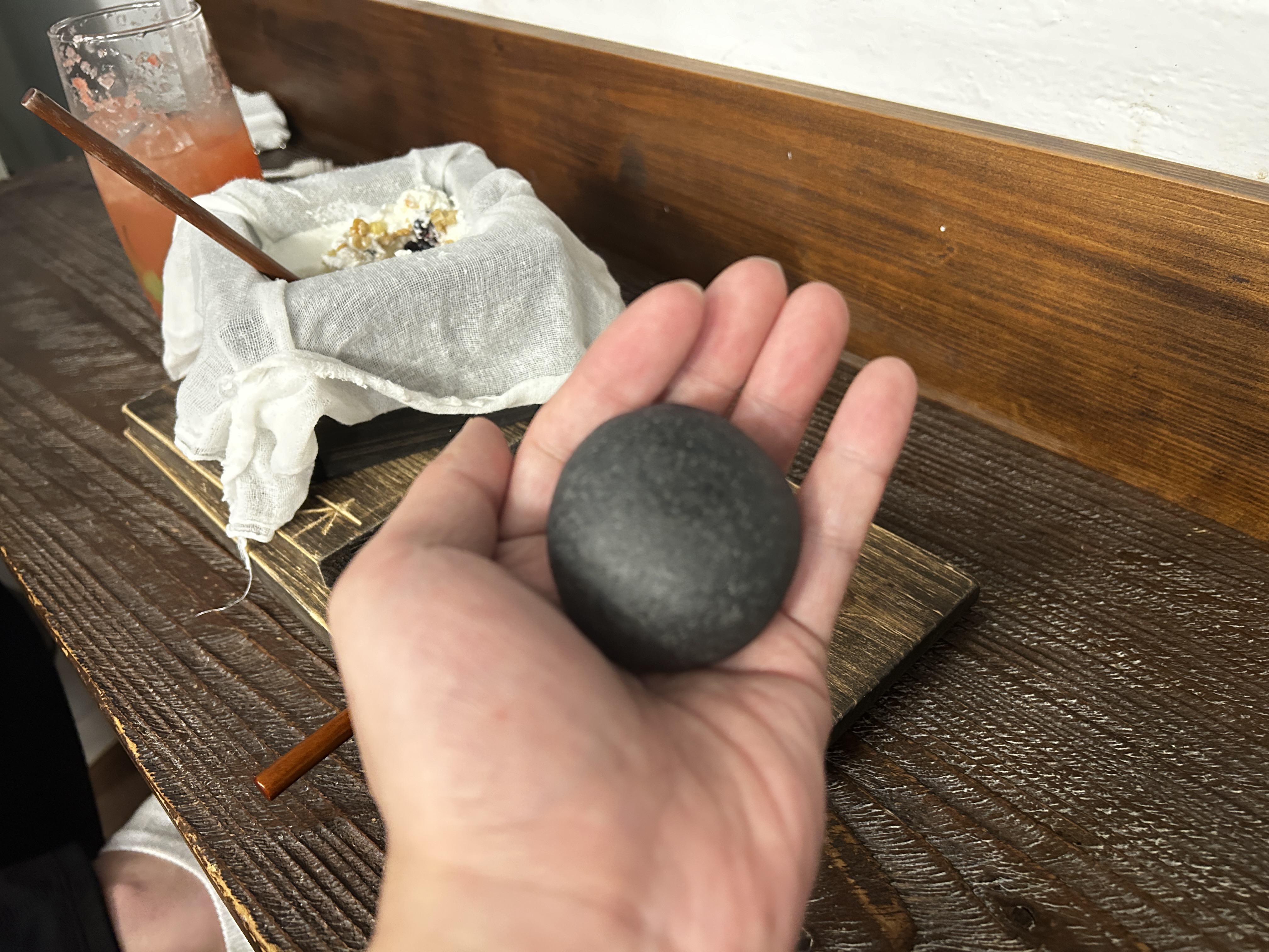 치즈 한모는 두부처럼 생겼다. 둥근 돌이 올라가 있다.